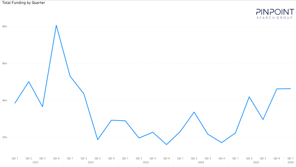 - The $4.6 Billion raised in Q1, 2026 represents a 108% increase in funding raised when compared to Q1, 2025.
