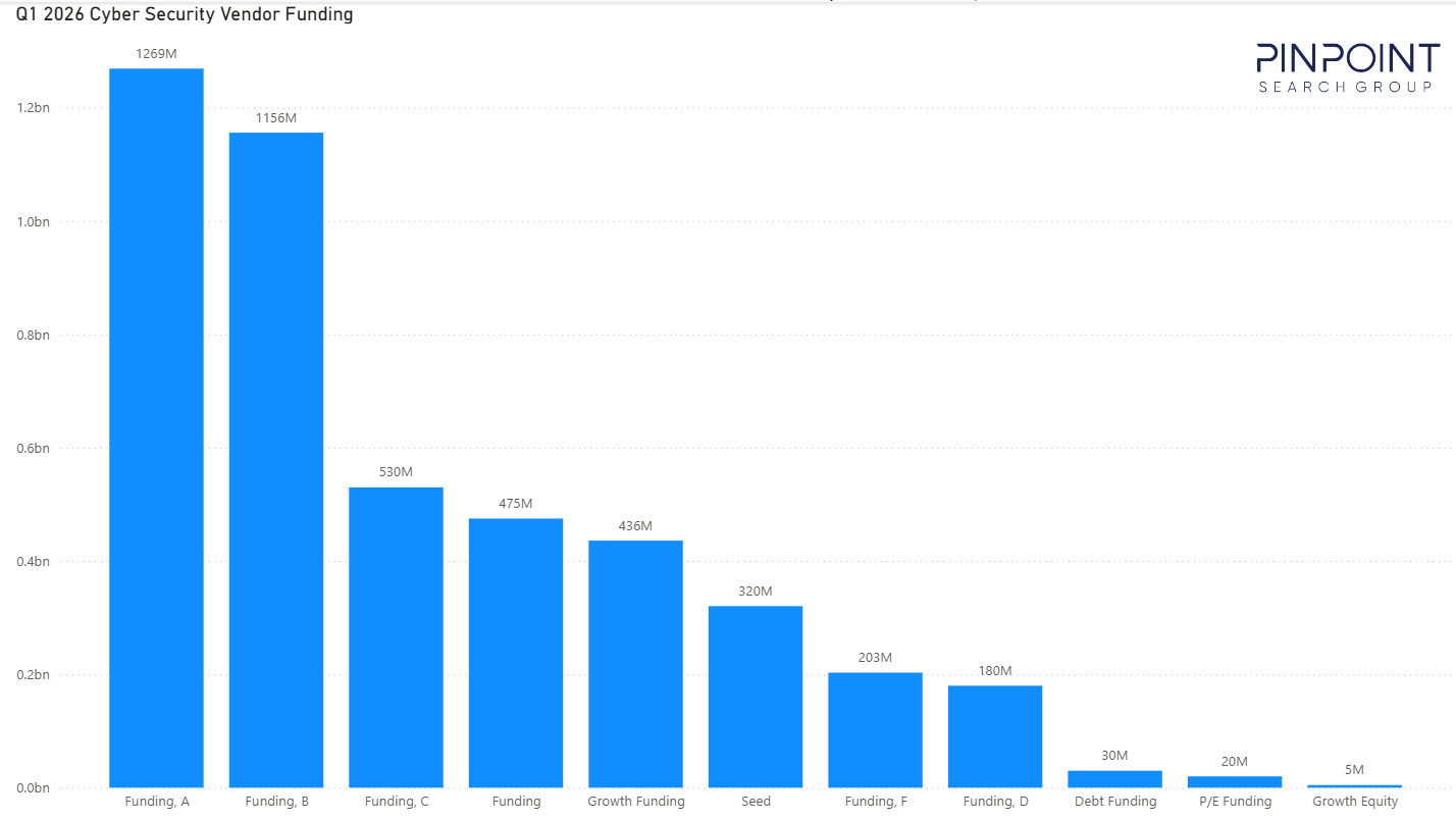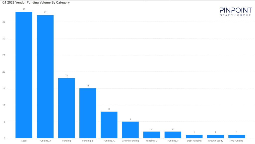 - Early stage funding (Seed, Series-A) represents 59% of all Q1, 2026 funding rounds recorded.