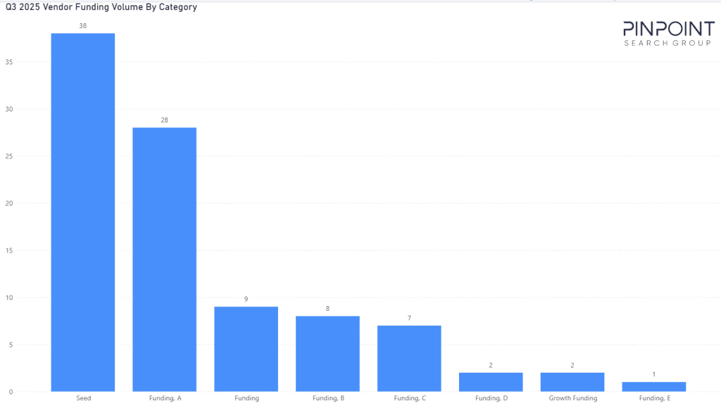 - Early stage funding (Seed, Series-A) represents 69% of all Q3, 2025 funding rounds recorded.